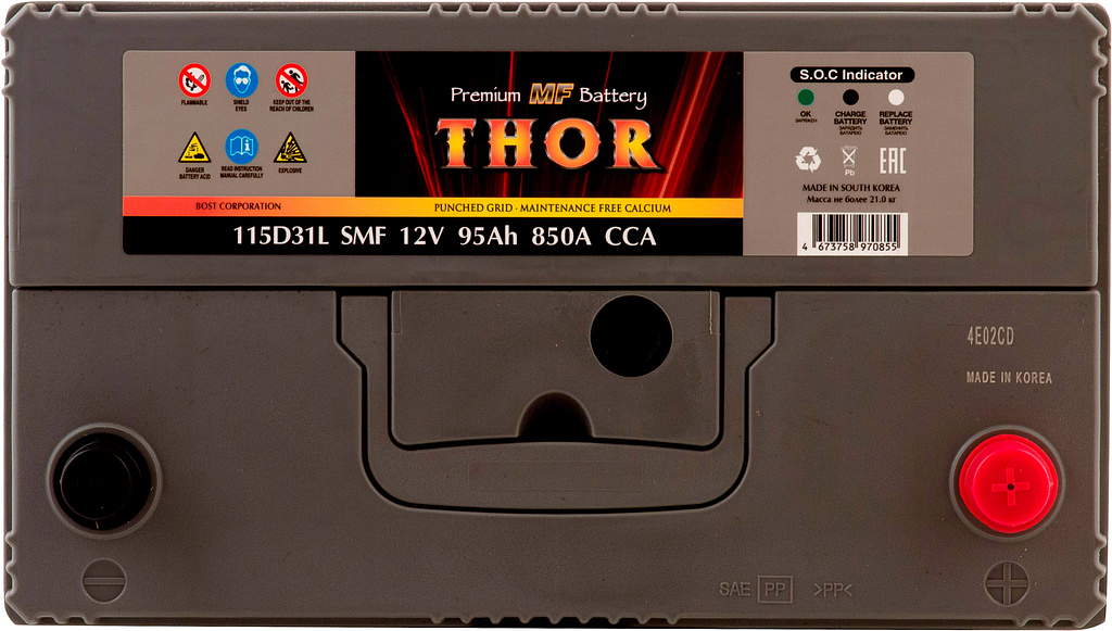 Автомобильный аккумулятор THOR SMF — серия аккумуляторов премиум-класса, выпускаемая заводом BOST CORPORATION (Южная Корея). Производитель применяет запатентованные технологии и материалы высокого качества, обеспечивая стабильную работу и продолжительный срок службы батарей.