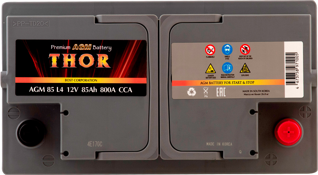 Автомобильный аккумулятор THOR AGM выпускается брендом THOR, принадлежащим корпорации BOST (Южная Корея). Эта серия аккумуляторов разработана с применением технологий AGM (Absorbent Glass Mat) и ориентирована на современные легковые автомобили с системой Start-Stop и высоким уровнем энергопотребления.