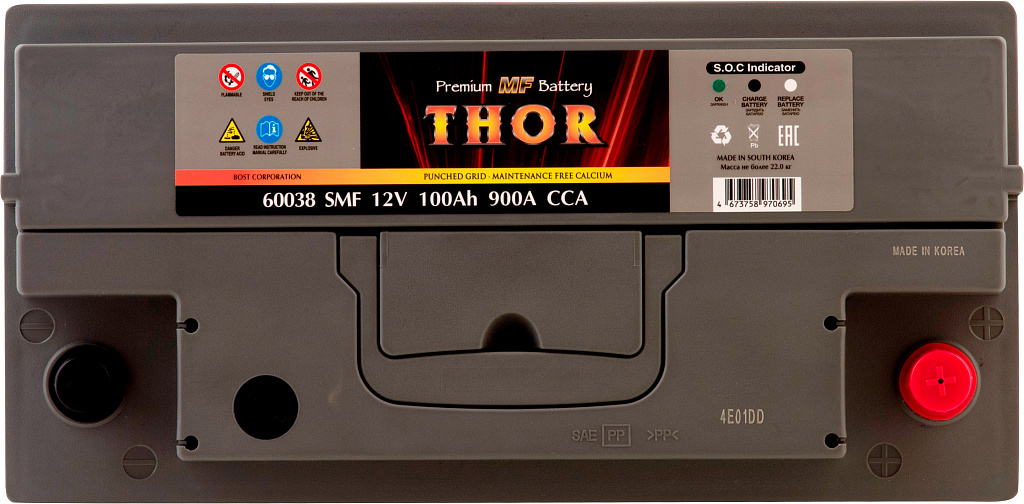 Автомобильный аккумулятор THOR SMF — серия аккумуляторов премиум-класса, выпускаемая заводом BOST CORPORATION (Южная Корея). Производитель применяет запатентованные технологии и материалы высокого качества, обеспечивая стабильную работу и продолжительный срок службы батарей.