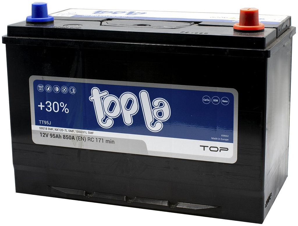Автомобильный аккумулятор Topla Asia Top (Top Sealed JIS) производится в Словении на заводе концерна TАV (г. Межица). Эта аккумуляторная батарея относится к полностью необслуживаемым и сохраняет стабильные характеристики в течение всего срока эксплуатации.